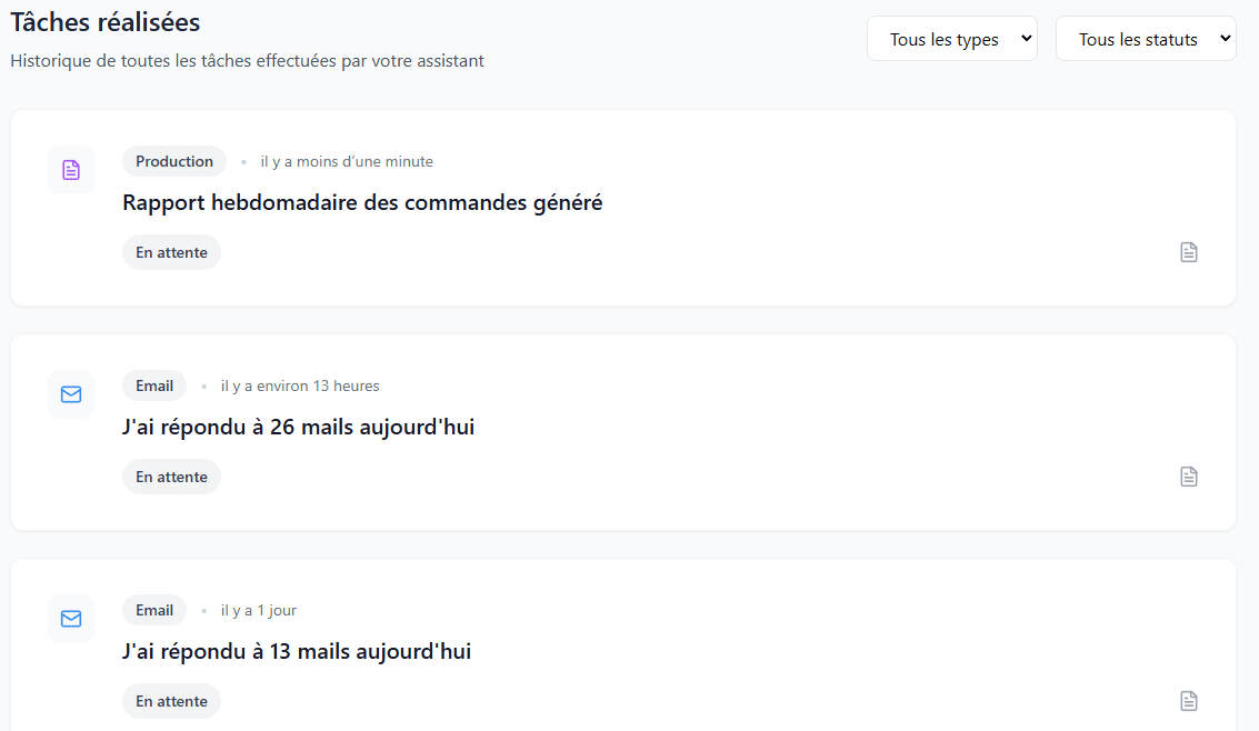 Notre assistant IA travaille de façon autonome pour vous. De la gestion des emails à la gestion de votre production, il s'occupe de tout pour vous.